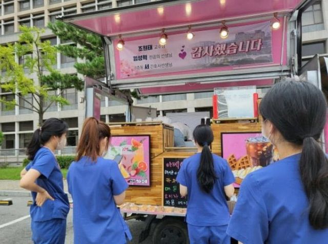 그의 주치의인 조 교수는 “환자분은 지난해부터 치료를 받고 있는 환자로 장기간 치료를 받으면서 많이 힘드셨을텐데 오히려 저희 의료진을 위해 커피차를 보내주셔서 감사하다”고 답례 인사를 전했다.