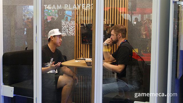 ▲ 챌린저스 게임즈 타무라 코지 대표와 구본무 BD도 인터뷰 후 곧바로 미팅에 들어갔다 (사진: 게임메카 촬영)