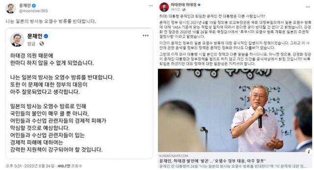 하 의원이 '문재인 정부도 오염수 방류에 대해 찬성태도를 보였다'고 하자 문 전 대통령은 "하태경 의원 때문에 한마디하지 않을 수 없게 됐다"며 "나는 일본의 방사능 오염수 방류를 반대한다"며 강하게 받아쳤다. 그러자 하 의원은 "대통령 문재인과 퇴임한 문재인 전 대통령은 다른 사람이냐"며 반박했다.