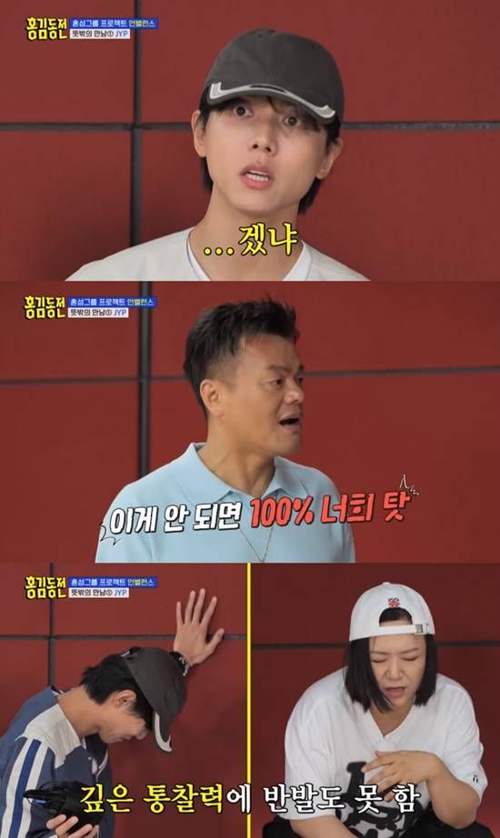 그러면서 박진영은 "만약 이게 안 되면 100% 너희 탓이다. 곡이 안 될 리가 없다'라며 단호하게 선을 그어 제작진까지 폭소를 터트렸다.
