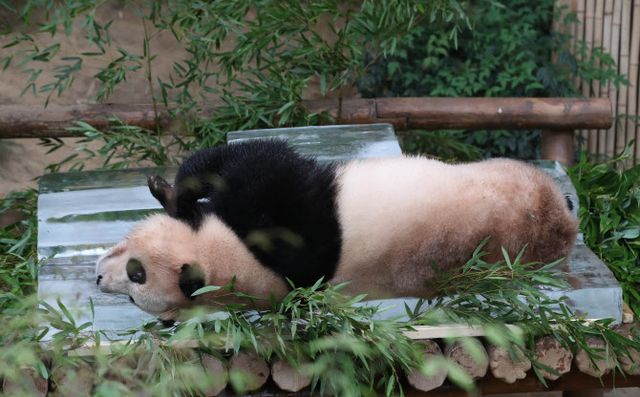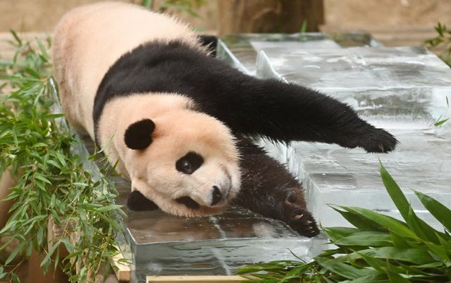 | 무더운 여름을 나고 있는 푸바오가 24일 오전 경기 용인시 처인구 에버랜드 판다월드에서 사육사들이 준비한 얼음 평상 위에서 더위를 식히고 있다(사진=뉴스1). |