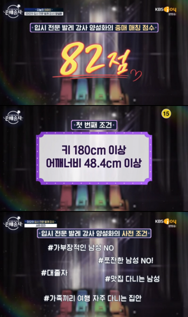 24일 방송된 KBS Joy·Smile TV Plus ‘중매술사’에는 입시 발레 강사가 출연해 인연을 찾았다.