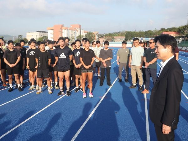 | ▲ 1. 김대중 전남교육감이 훈련에 매진하고 있는 학생 선수들에게 격려의 말을 전하고 있다. |