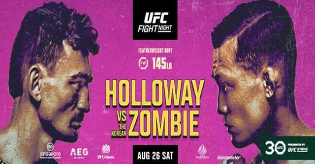 정찬성과 할로웨이의 경기 UFC 파이트 나이트: 할로웨이 VS 코리안 좀비 메인카드는 8월 26일 토요일 오후 9시부터 시작되며, 언더카드는 오후 6시부터 TVING, tvN SPORTS를 통해 생중계 될 예정이다.