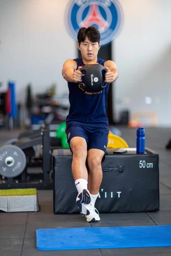 PSG는 25일(한국시간) 구단 소셜네트워크서비스(SNS)를 통해 실내에서 훈련 중인 이강인의 사진을 공개했다. 사진에서 그는 케틀벨을 들고 오른쪽 다리를 든 채 한 다리로 스쿼트를 진행하고 있다.