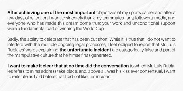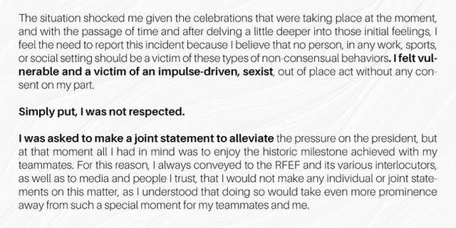 이어 “나는 당시에 그랬던 것처럼 키스 행위가 내 마음에 들지 않았다는 것을 다시 한번 강조하고 싶다. 나는 공격적이고, 충동적인 성차별적인 행동의 피해자라고 느꼈다. 축구협회장의 받는 부담을 덜어주기 위한 성명서를 작성해달라는 요청을 받았다”며 스페인 축구협회의 만행까지 폭로했다.