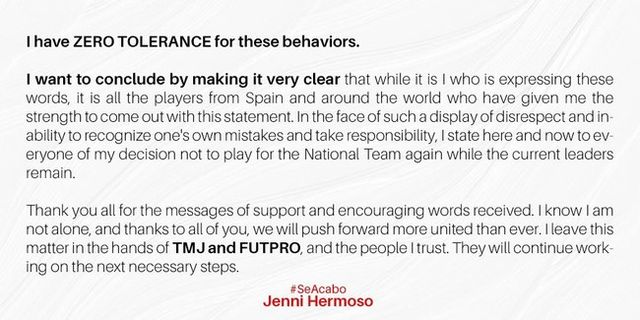 마지막으로 에르모소는 “결과를 감수하지 못하는 그러한 무례함과 무능력에 직면하여, 나는 현 리더십이 지속되는 한 국가대표팀에 복귀하지 않기로 결정했다”며 대표팀의 부름에 더 이상 응하지 않겠다고 입장을 발표했다.