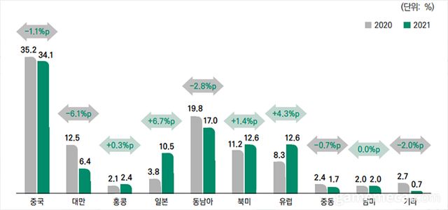 크지만, 그 대부분이 중국, 중화권, 동남아 등 특정 지역에 쏠려 있다. 수출에 있어서 특정 국가에 대한 의존도가 높으면 중국이 판호 발급을 제한하며 신작을 낼 수 없었던 시기처럼 국내에서 컨트롤할 수 없는 해외 이슈에 휘둘리기 쉽다. 아울러 국내 역시 주력인 모바일게임이 성숙기에 접어든 와중 내부 경쟁이 치열해지며 더 진지하게 신흥 시장 개척을 고려해볼 시기가 됐다.
