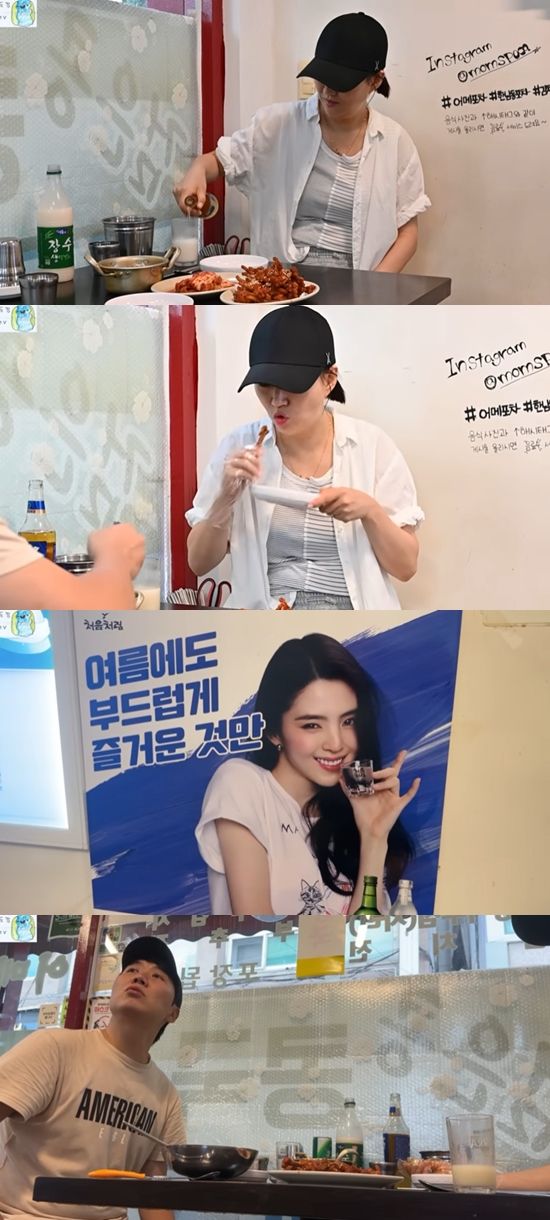 가게 벽에 붙은 소주 포스터 속 한소희의 포스터를 보며 "저렇게 예쁘게 술을 마셔야 한다"며 따라 하기도 했다. 이에 도경완은 무심하게 "내 눈에는 쟤(한소희)나 얘(장윤정)나 비슷해"라며 애정을 드러냈다.