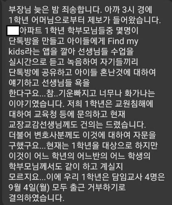 교사 A씨는 “아까 3시쯤에 1학년 어머님으로부터 제보가 들어왔다. ○○아파트 1학년 학부모님들 중 몇 명이 단체 대화방을 만들고 아이들게 ‘Find my kids’라는 앱을 깔아"
