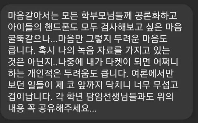 그러면서 “모든 학부모님께 공론화하고 아이들의 휴대전화도 모두 검사해보고 싶은 마음이 굴뚝같으나 마음만은 그렇지, 두려운 마음도 크다. 혹시 내 녹음 자료를 가진 것은 아닌지, 나중에 내가 타깃이 되면 어쩌나 하는 개인적인 두려움도 크다”고 호소했습니다.