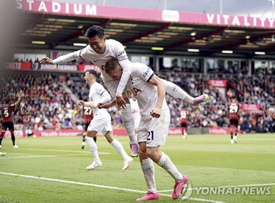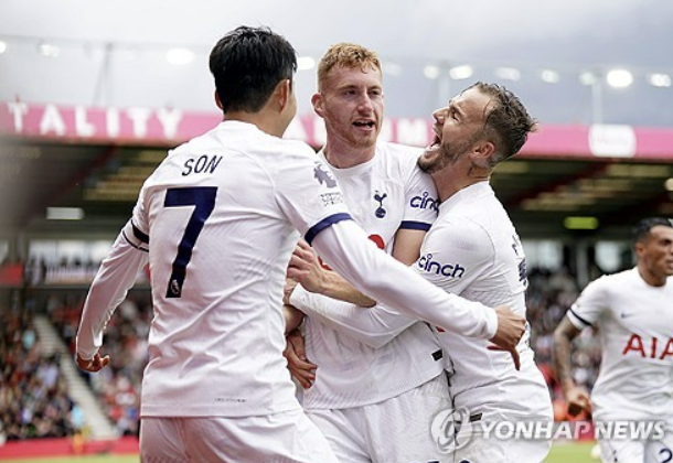 토트넘은 26일(한국시간) 영국 본머스 바이털리티 스타디움에서 열린 2023/24시즌 잉글리시 프리미어리그 3라운드 본머스와의 원정 경기에서 전반 17분 제임스 매디슨의 선제골, 후반 18분 데얀 쿨루세브스키의 추가골을 묶어 2-0 완승을 거뒀다.
