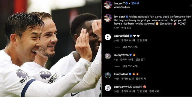 손흥민은 본머스전 직후 SNS를 열어 짜릿한 승리의 감흥을 되살리고 팬들에게 고마움을 드러냈다.