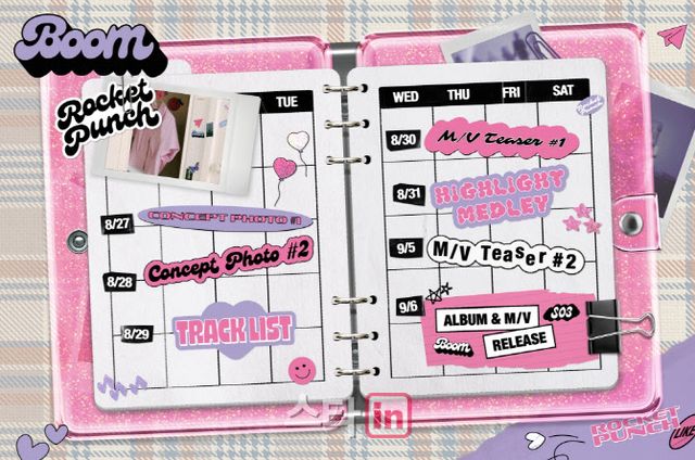 공개된 이미지는 사랑스러운 체크 패턴의 유니크한 배경 위로 핑크색 다이어리가 펼쳐져 있다. 여기에 ‘붐’의 티징 일정이 다양한 글자와 스티커로 아기자기하게 꾸며져 있다.