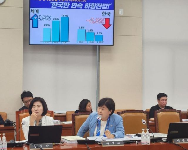 서영교 의원은 추경호 기재부 장관을 상대로 한 경제 현안에 대한 질의에서 “경제 상황이 최악이다. 만나는 국민마다 경제가 어렵다고 하신다. 먹고사는 문제가 제일 중요한데 이렇게 경제가 어려울 때 정부가 국민에게 손을 내밀어야 한다. 어려운 경제를 살려줄 수 있도록 국가가 예산도 만들어야 한다. 그런데 국민이 낸 세금을 국가가 꽁꽁 틀어쥐고 경제도 못 살리고 물가는 천정부지고 민생은 고통스럽다.”며 현 경제상황의 어려움을 지적했다.
