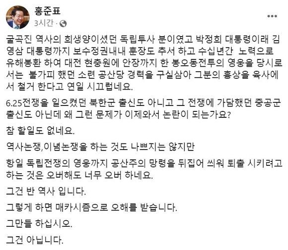 홍 시장은 "6.25 전쟁을 일으켰던 북한군 출신도 아니고, 그 전쟁에 가담했던 중공군 출신도 아닌데 왜 그런 문제가 이제와서 논란이 되나요. 참 할 일도 없다"고 지적했다. 그는 "역사논쟁, 이념논쟁을 하는 것도 나쁘지는 않지만 그것은 반역사다. 항일 독립전쟁의 영웅까지 공산주의 망령을 뒤집어씌워 퇴출시키려고 하는 것은 오버해도 너무 오버"라고 목소리를 높였다.