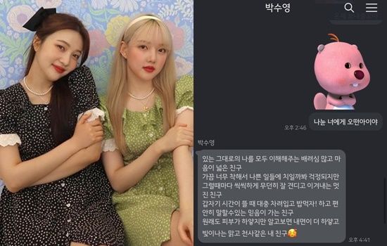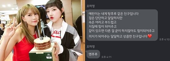 예린이를 향한 응원의 메시지가 또 있다. 바로 팬들도 응원하는 아이돌 대표 친목 라인 '구육(96)즈' 조이(레드벨벳)와 오하영(에이핑크)이다. 이들 삼인방은 1996년생 동갑내기, 여기에 서울공연예술고등학교 동창으로 오랜 우정을 자랑하고 있다.
