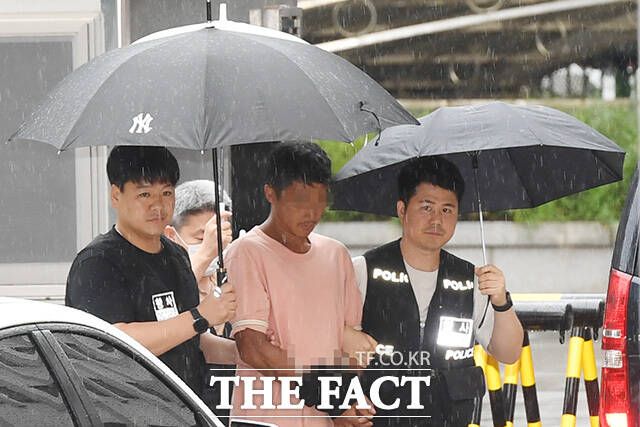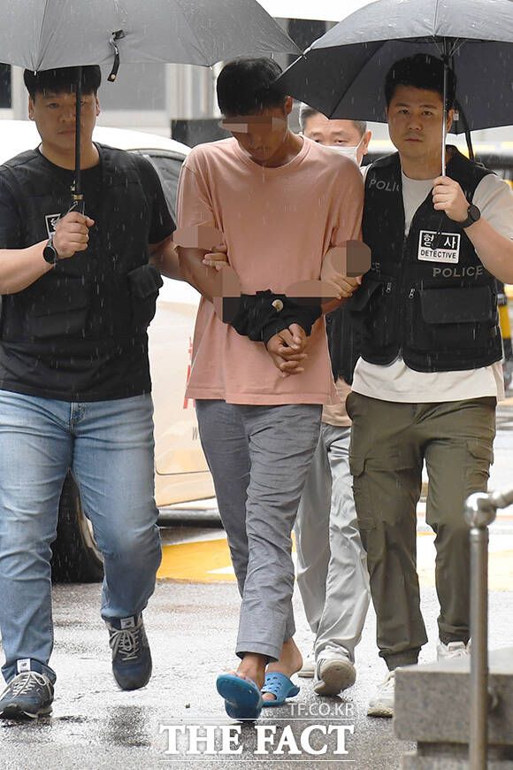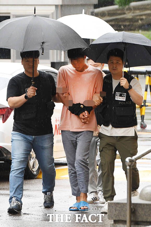 은평구 주택가 일대에서 흉기 난동을 벌인 피의자 정 모 씨(가운데)가 28일 오전 서울 마포구 서울서부지방법원에서 열리는 구속 전 피의자 심문(영장실질심사)을 받기 위해 출석하고 있다. /장윤석 인턴기자