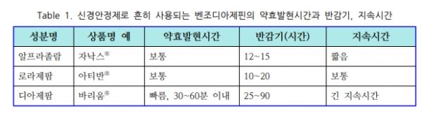 신경안정제로 흔히 사용되는 벤조디아제핀의 약효발현시간과 반감기, 지속시간 /약학정보원