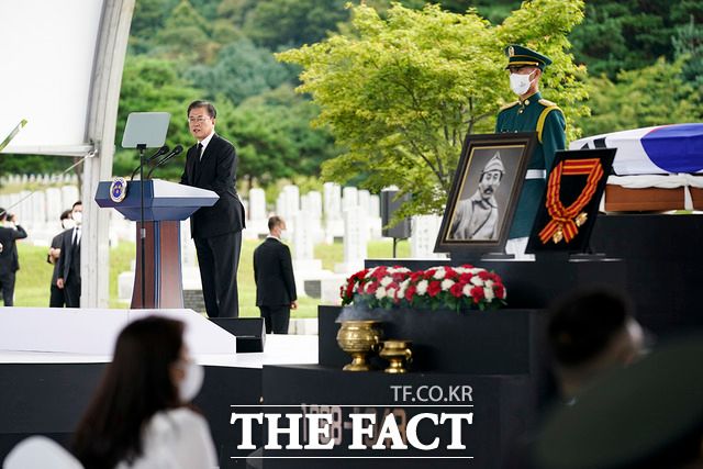 2021년 8월 18일 당시 문재인 대통령이 국립대전현충원에서 열린 홍범도 장군 유해 안장식에 참석해 추념사를 하는 모습. /청와대 제공