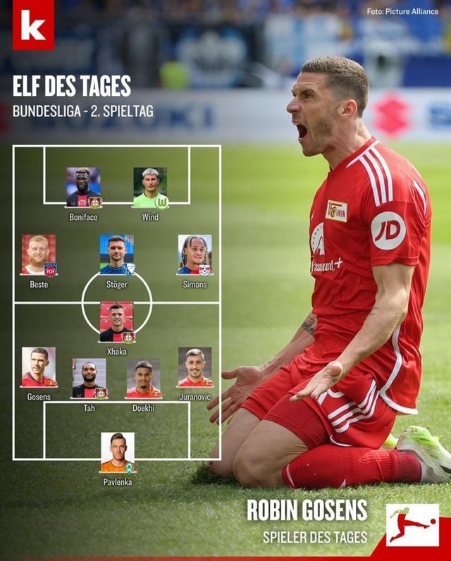 독일 ‘키커’는 29일(한국시간) 2023-24시즌 독일 분데스리가 2라운드 베스트 일레븐을 뽑았다. 빅터 보니페이스, 그라니트 자카, 조나단 타(이상 레버쿠젠), 요나스 빈(볼프스부르크), 얀-니클라스 베스테(하이덴하임), 케빈 슈퇴거(보훔), 사비 시몬스(라이프치히), 로빈 고젠스, 다닐로 두에키, 요십 유라노비치(이상 우니온 베를린), 이르지 파블렌카(베르더 브레멘)가 이름을 올렸다.