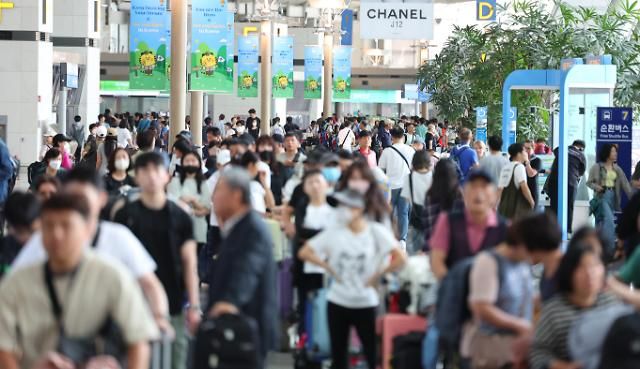 夏季出游高峰,仁川国际机场人山人海。【图片提供 韩联社】