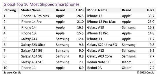去年上半年,iPhone 13出货量为3370万部,iPhone 13 Pro Max为2300万部,Galaxy A13为1620万部,分别排在前三位。