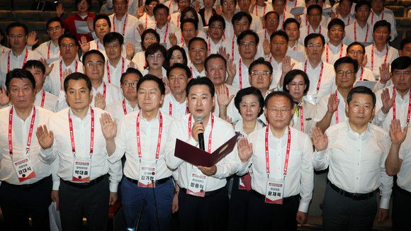 국민의힘은 결의문에서 "집권 2년차를 맞아 여러 성과를 만들어내야 하지만 무너진 국가 시스템을 정상화하고 망가진 경제를 회복시키는데에도 많은 어려움이 있는 상황"이라며 "절대 다수의 야당은 각종 악법을 밀어붙여 정부·여당에 정치적 부담을 떠안기고 후쿠시마 오염수 사태와 같은 선동 정치로 국민을 혼란과 고통에 빠뜨리고 있다"고 말했다.