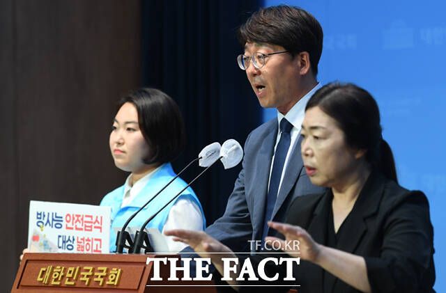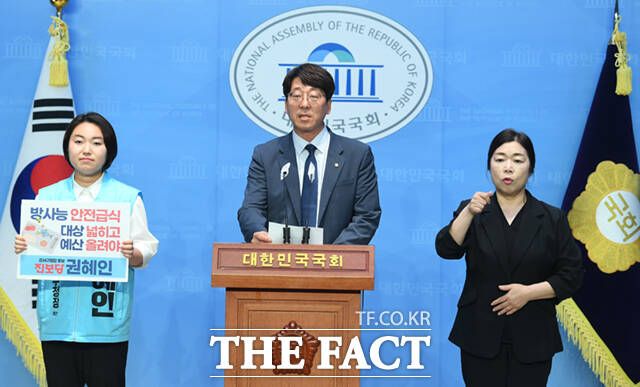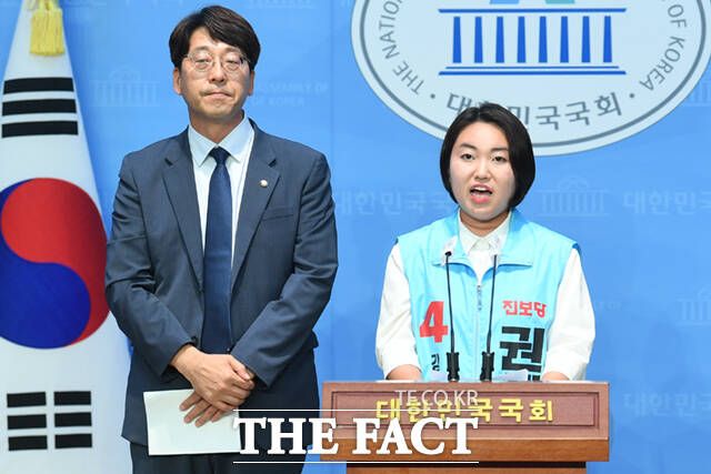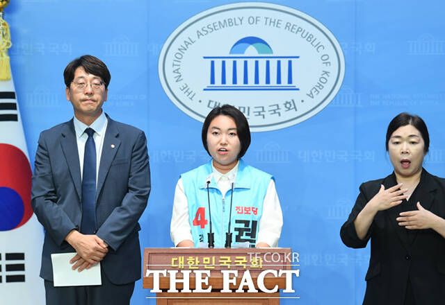 권혜인 진보당 강서구청장 후보(가운데)가 29일 오전 서울 여의도 국회 소통관에서 강서구 '방사능 안전급식 조례'의 대상·예산 확대 공약 발표 기자회견을 하고 있다. /국회=이새롬 기자