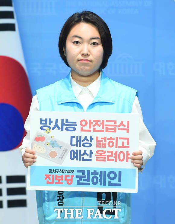 [더팩트ㅣ국회=이새롬 기자] 권혜인 진보당 강서구청장 보궐선거 예비후보가 29일 오전 서울 여의도 국회 소통관에서 강서구 '방사능 안전급식 조례'의 대상·예산 확대 공약 발표 기자회견을 하고 있다.