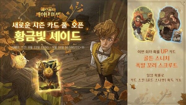 시즌 업데이트를 기념해 ‘황금빛 셰이드’ 카드 풀도 오픈된다. 오는 9월 18일까지 한정 기간동안 더 높은 뽑기 확률로 인기 아이템 ‘골든 스니치’ 및 ‘폭발 꼬리 스크루트’ 카드를 획득할 수 있으며, 뽑기 열람 횟수를 30회 및 60회 달성하면 불타는 키도 추가 지급된다.