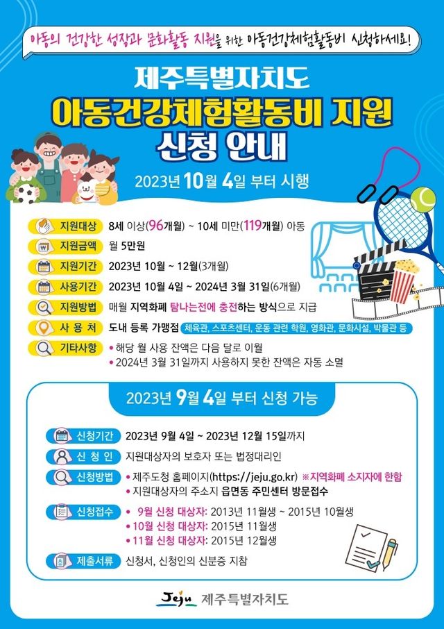 10월 4일부터 시행하는 제주도 아동건강체험활동비 지원 관련 신청 안내문 / 제주도청 제공