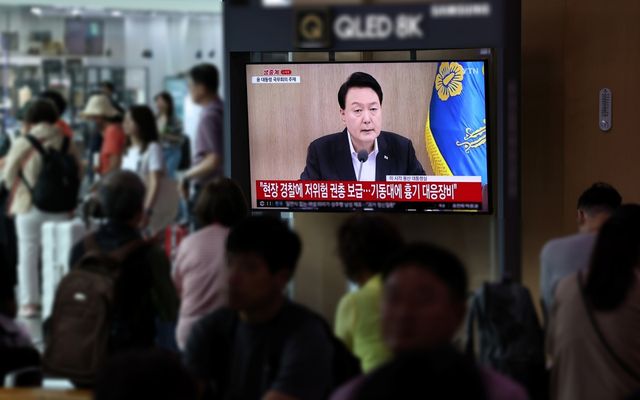 29일 오전 서울역 대합실에서 시민들이 윤석열 대통령이 주재하는 국무회의 생중계 영상을 시청하고 있다. / 뉴스1