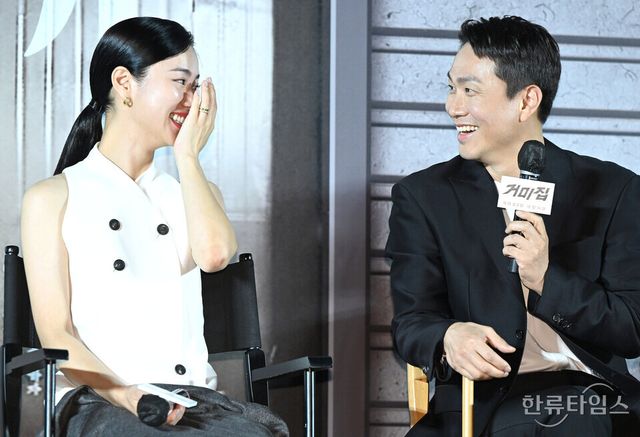 배우 전여빈, 오정세가 29일 오전 서울 용산구 CGV 용산아이파크몰에서 열린 영화 '거미집' 제작보고회에 참석해 취재진의 질문에 답하고 있다.