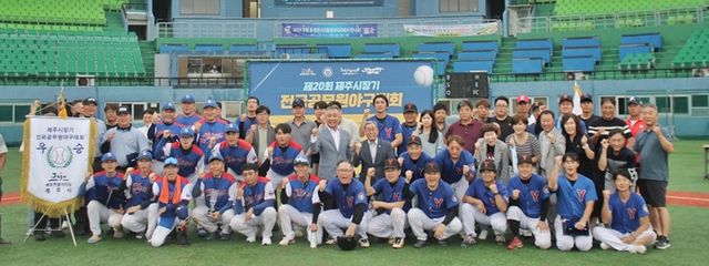 제20회 제주시장기 전국 공무원 야구대회 결승전 후 기념 사진 촬영하는 선수들. 제주시체육회 제공