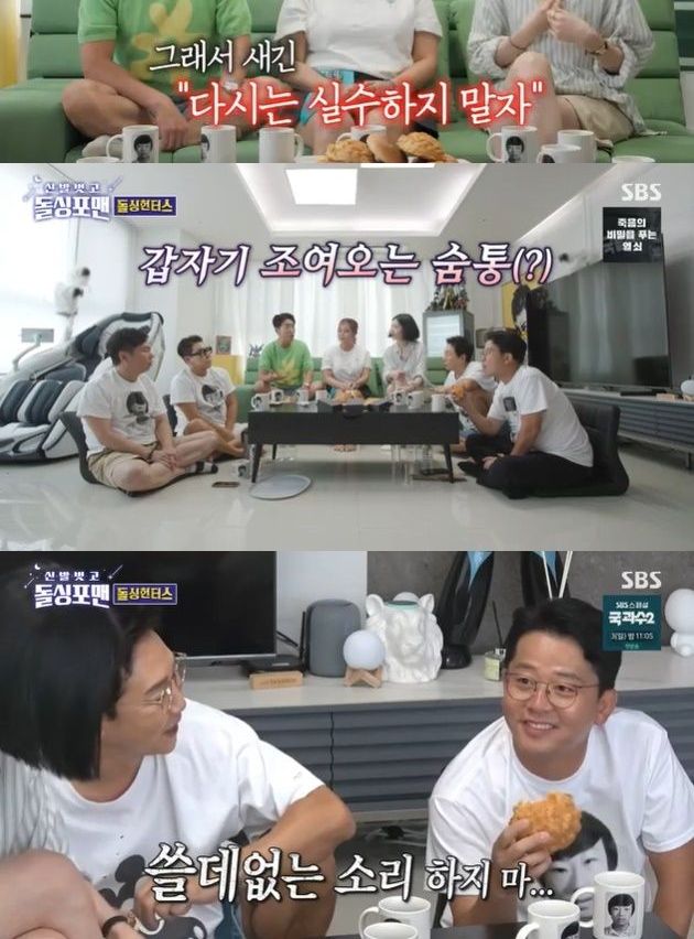 그러자 탁재훈이 "(예전 같았으면) 숨어 살아야 했다"라고 거들었다. 이상민 역시 "옛날에는 그랬지. 이혼하고 빚 있으면 숨어 살았다"라며 공감했다. 이에 장동민이 "시대가 바뀌어서 마이크 차고 앉아 있지~"라고 농을 던져 주위를 웃음바다로 만들었다.