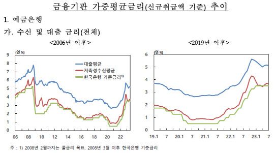 한국은행이 30일 발표한 ‘7월 금융기관 가중평균금리’에 따르면 지난달 예금은행의 신규 취급액 기준 대출금리는 5.11%로 전월대비 0.06%포인트 하락했다. 3개월 만의 하락 전환이다.
