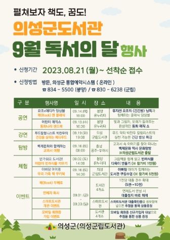 올해 9월 독서의 달은 '펼쳐보자 책도, 꿈도!'슬로건 아래 의성군 도서관(군립, 봉양온누리터, 금성면작은, 다인면작은, 스마트도서관)에서 11개의 독서행사(강연, 강연, 탐방, 가족체험, 이벤트)를 운영한다. 공연으로는 △북콘서트 북앤클래식 △어린이매직쇼 동화나라 샌드북, 저자강연으로 △박찬우 푸드칼럼리스트 △이수정 범죄심리학자 특강, 문학탐방으로 △ 백제문화와 함께하는 교과서여행, 가족체험교실로 △어린이 반려식물 키우기 △우리가족 책쿠키북을 진행한다.