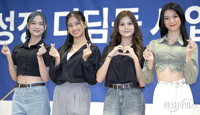 인도네시아 걸그룹 스타비가 30일 오전 서울 중구 충무아트홀에서 열린 '2023 동반성장 디딤돌 사업 국내' 기자간담회에 참석해 포토타임을 갖고 있다.