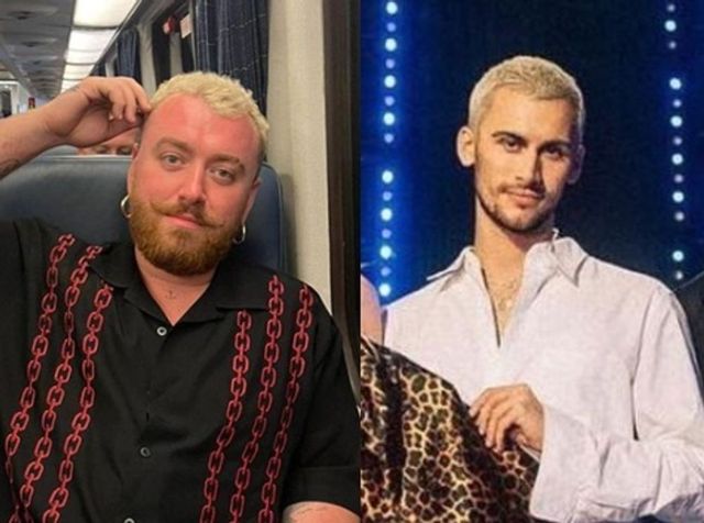 샘 스미스는 편안한 검은색 티셔츠에 검은색 트레이닝복 바지를 입고 있었다. 그는 짧게 자른 금발 머리에 덥수룩한 수염을 자랑했다. 샘 스미스는 링 귀걸이까지 착용한 모습이었다.