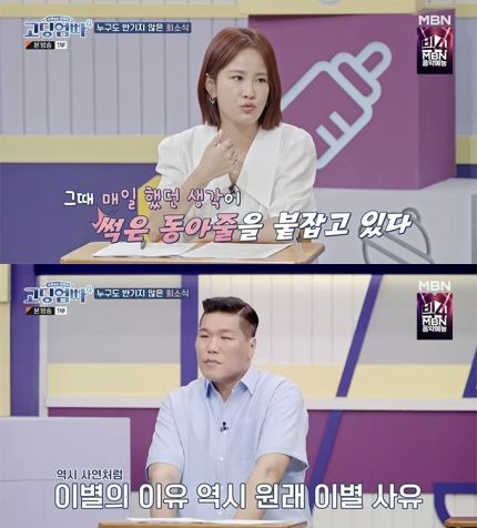 김지민은 “제 주변에도 그렇고, 처음 만났던 남자친구와 재결합해서 다시 만난 적이 있었는데 그때 매일매일 든 생각이 썩은 동아줄을 붙잡고 있는 것 같았다. 언제 끊어질지 모르는 느낌이었다”라며 “결국 헤어질 때도 첫 번째 싸웠던 이유랑 같은 이유로 헤어지더라. 그 이후로 무슨 일이 있어도 재결합은 절대 안 한다”라고 설명했다.