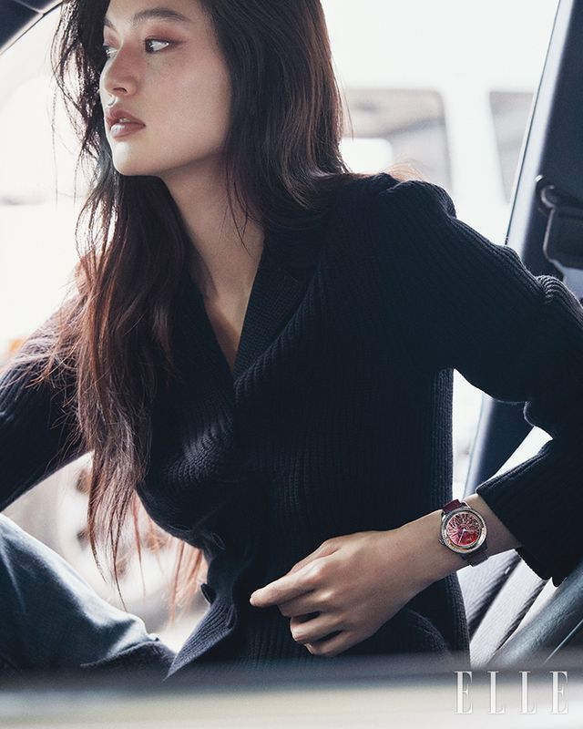 핑크 사파이어와 루비, 레드 마더 오브 펄, 다이아몬드가 강렬한 느낌을 주는 ‘디올 윗 그랑발 자댕 플뤼리 타임피스’ 워치는 Dior Timepiece. 네이비 니트 재킷과 데님 팬츠는 모두 Dior.