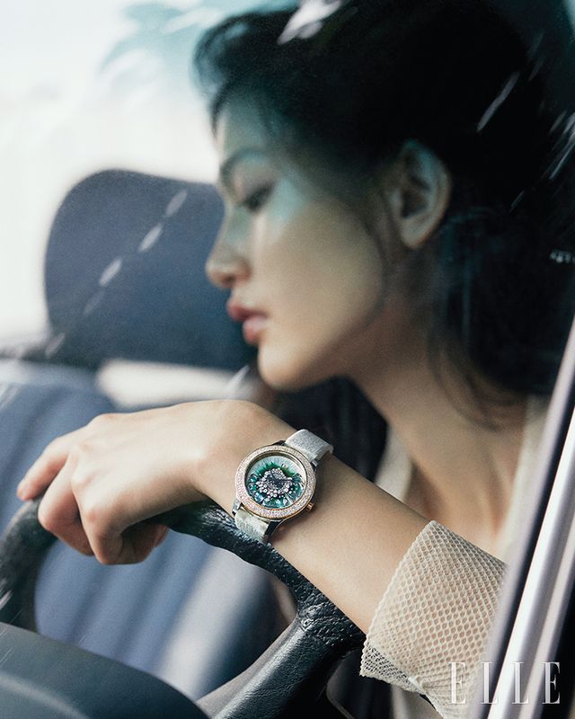 그린 매트 타이다이 이펙트와 마더 오브 펄 다이얼, 화이트 벨벳 스트랩이 우아한 분위기를 자아내는 ‘디올 그랑발 미스 디올 타임피스’ 워치는 Dior Timepiece. 네트 셔츠는 Dior.