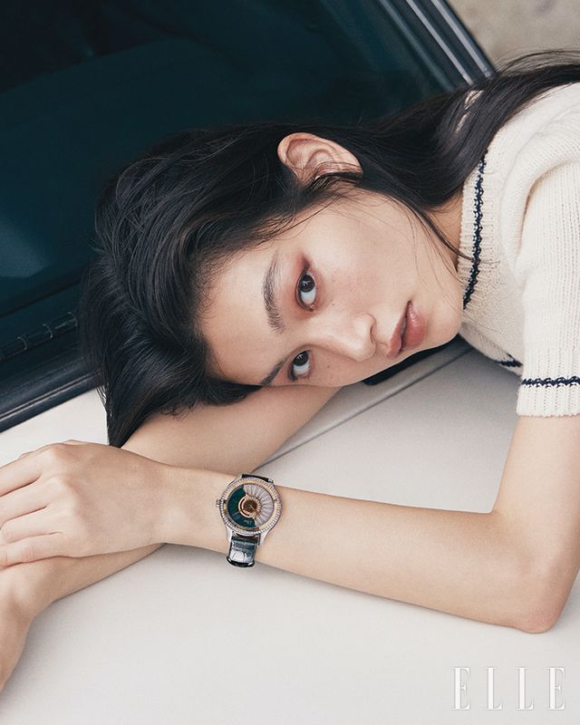 옐로골드와 말라카이트, 다이아몬드가 어우러져 서정적인 디자인으로 완성된 그린 컬러의 ‘디올 윗 그랑발 타임피스’ 워치는 Dior Timepiece. 니트 톱은 Dior.