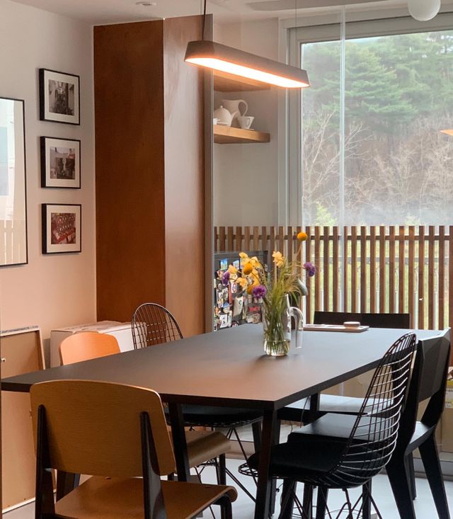 프렌치 모더니즘 작가들의 가구를 애정하는데요. 그중에서도 장 프루베를 가장 좋아해요. 의자는 같은 브랜드로 통일시키지 않고 공통된 컬러나 테마 아래 다양하게 믹스 매치하는게 재밌는 것 같아요.