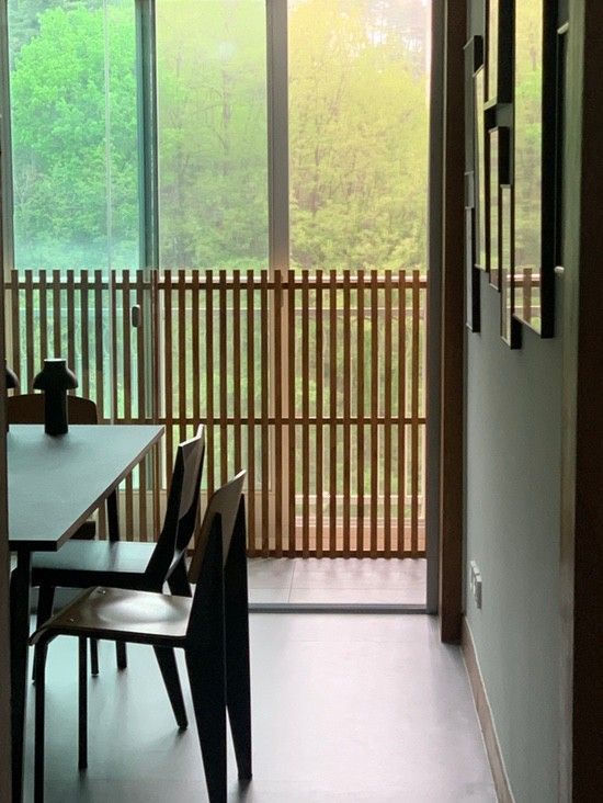 키친 싱크대와 발코니의 우드 펜스 정보를 많이 물어보시는 편이에요. 우드 펜스는 목공 작업이 진행될 때 펜스를 짜서 맞췄어요. 베란다의 철제 난간이 거실 무드를 해친다고 생각했기 때문에 가려본 건데 만족스러워요.