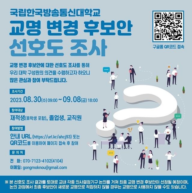 [일요시사 취재2팀] 김해웅 기자 = 지난 30일, 국립한국방송통신대학교(이하 방송대)가 ‘국립한국방송통신대학교 교명 변경 후보안 선호도 조사’를 실시한다는 공고를 냈다. 방송대는 이날 “교명 변경 후보안에 대한 선호도 조사를 통해 우리 대학 구성원의 의견을 수렴하고자 하오니 많은 관심과 참여 부탁드린다”며 안내 포스터를 게재했다.