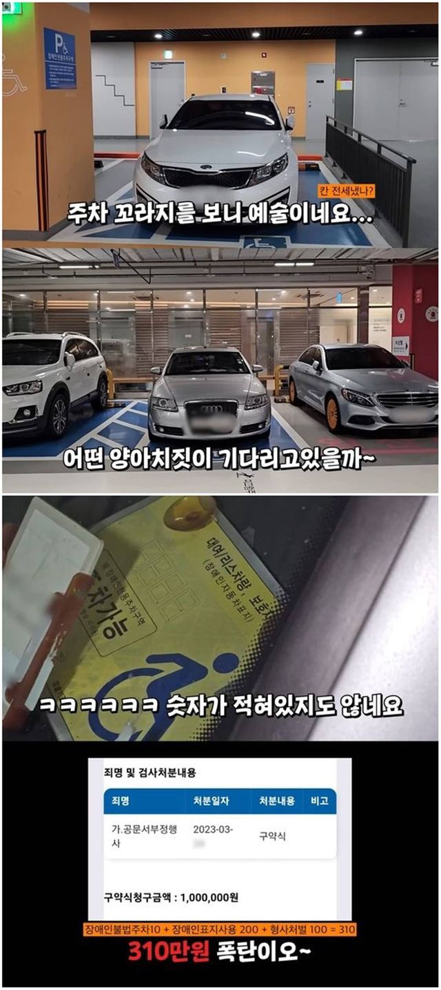 대형 백화점 VIP 등급에 속한 일부 고객들이 차량을 장애인전용주차구역에 불법 주차한 모습과 이에 대한 처분 결과.