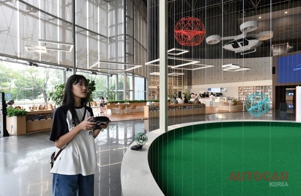 삼성화재 모빌리티뮤지엄은 자동차, 기차, 배, 비행기 등 모빌리티가 지나온 길부터 친환경, 자율주행, UAM, 드론, 우주여행 등 모빌리티가 나아갈 길까지 다양한 모빌리티 테마로 구성되었다. 1층 로비에 들어서면 먼저 이전에 볼 수 없었던 북카페가 들어서 여유 있게 공간을 둘러볼 수 있는 쉼표를 준다. 그리고 가운데 높이 13m의 방사형 드론 타워가 시선을 끈다. 드론을 대여해 누구나 조종해볼 수 있게 했다. 체험 공간은 레이싱게임부터 UAM, 미니카 레이스, 나만의 전기차 만들기, 안전한 모빌리티 드라이빙 등으로 이어진다.