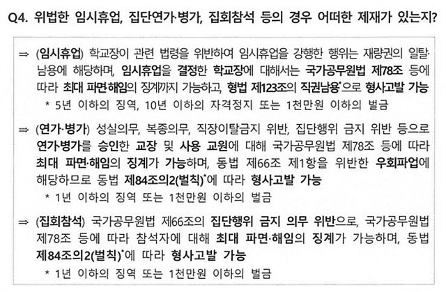 교육부는 지난 8월 27일 <9.4. 불법 집단행동 관련 학사 운영 및 교원 복무관리 철저 요령>을 교육청에 보냈다. 교사들이 시휴업을 결정하거나 연가·병가를 승인한 교장, 이를 사용한 교원 모두 파면·해임 징계를 한다는 내용이다.